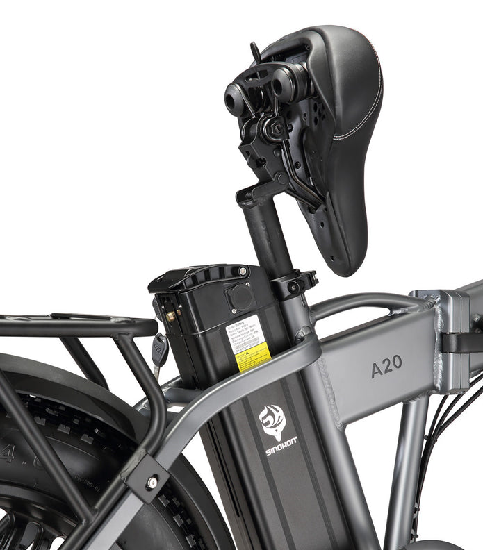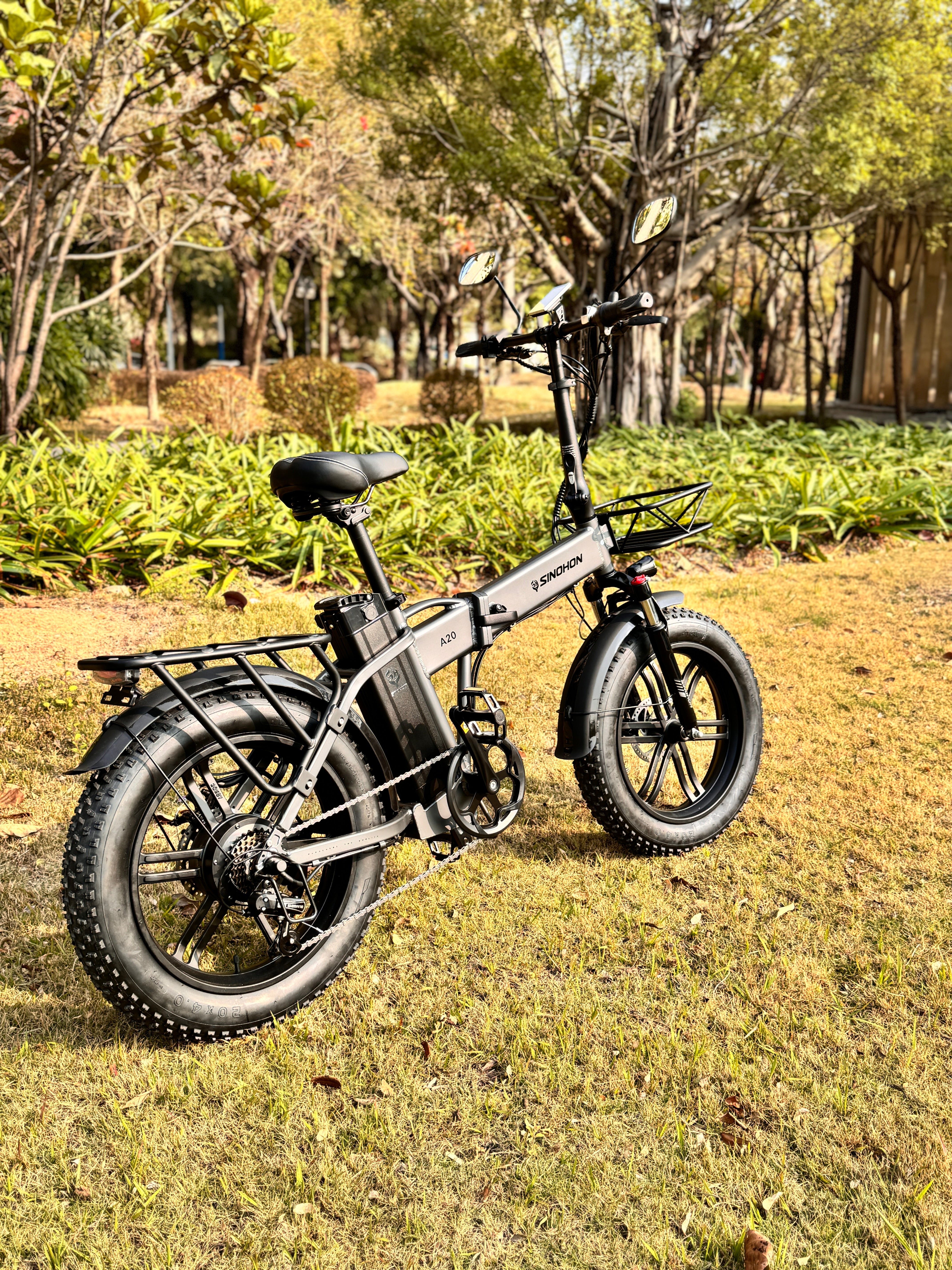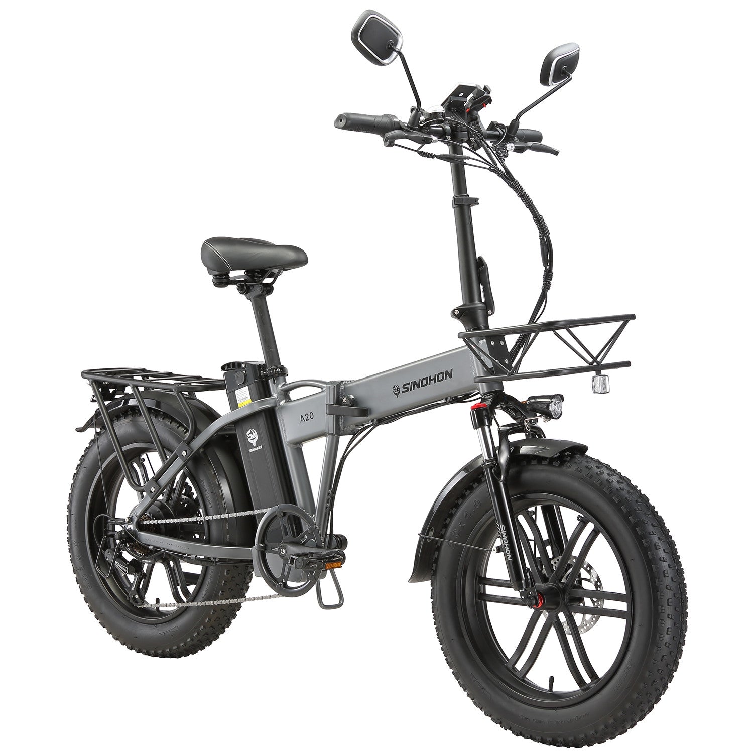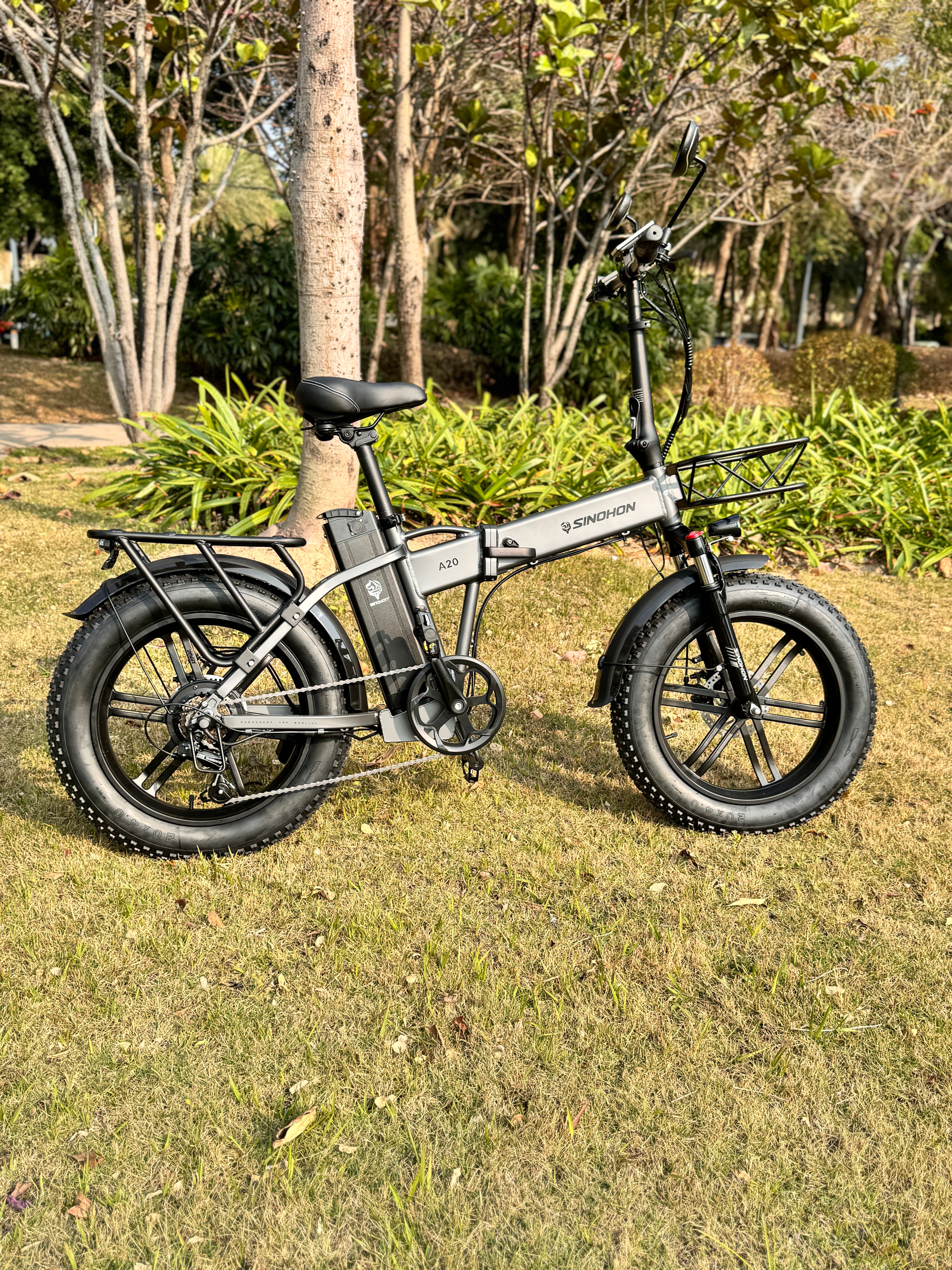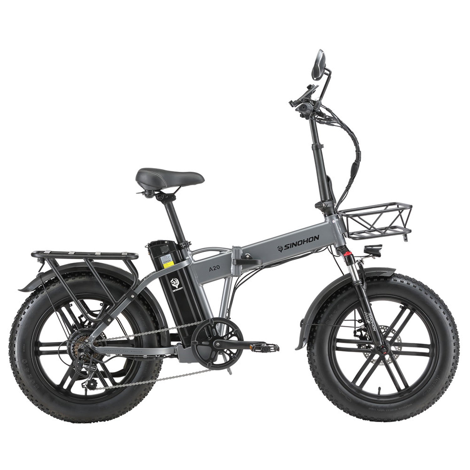 Sinohon A20 electric bike equipped with powerful peak 1000W motor / 20"x4.0 fat tires / front fork suspension / shimano 7 Speed derailleur system / foldable alloy frame, providing you with a smooth and powerful riding experience.