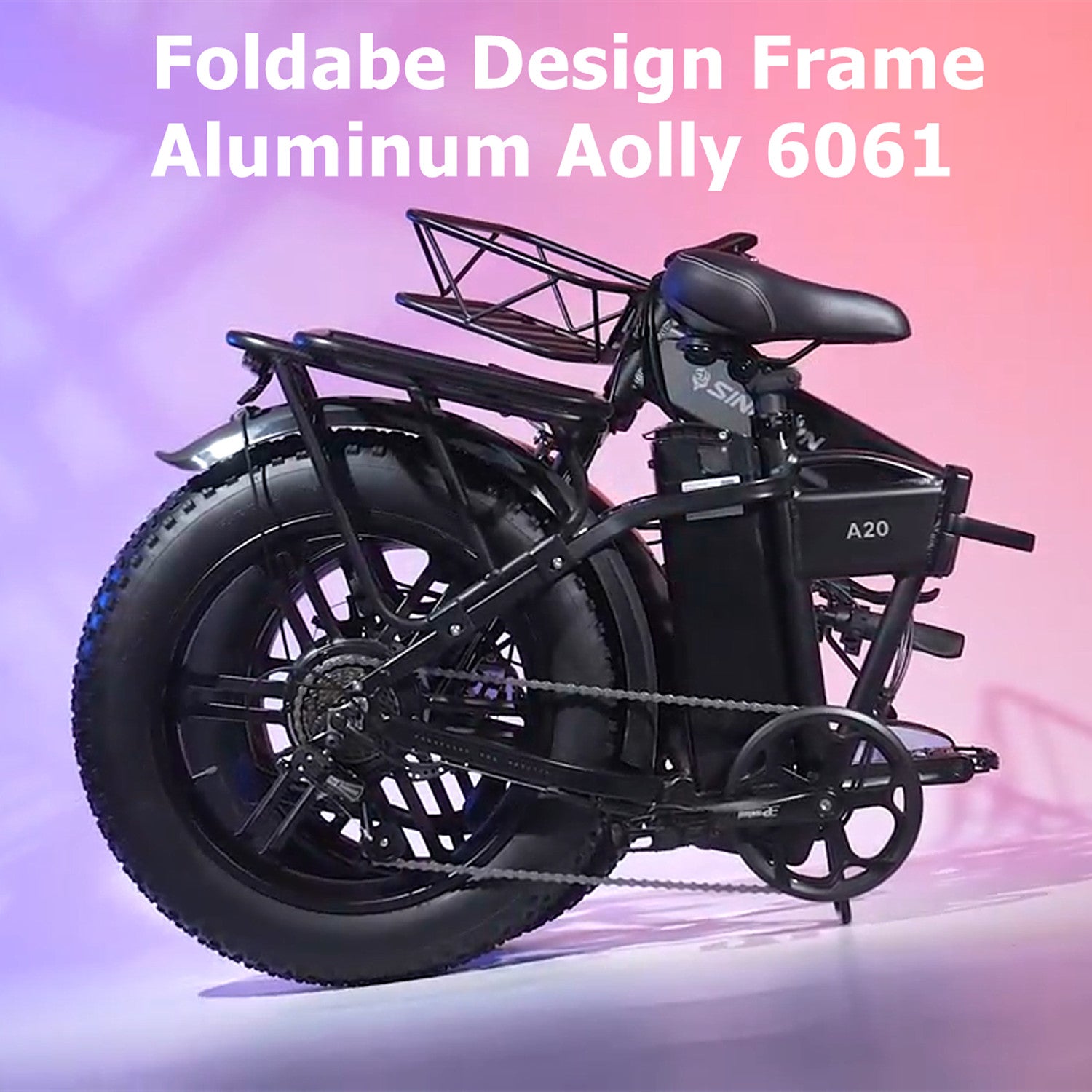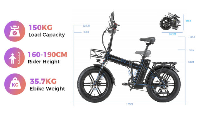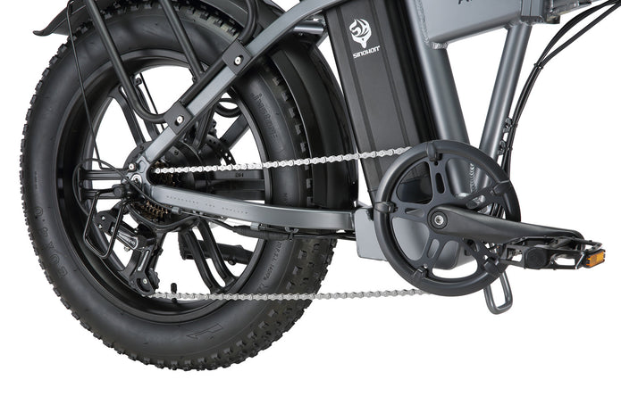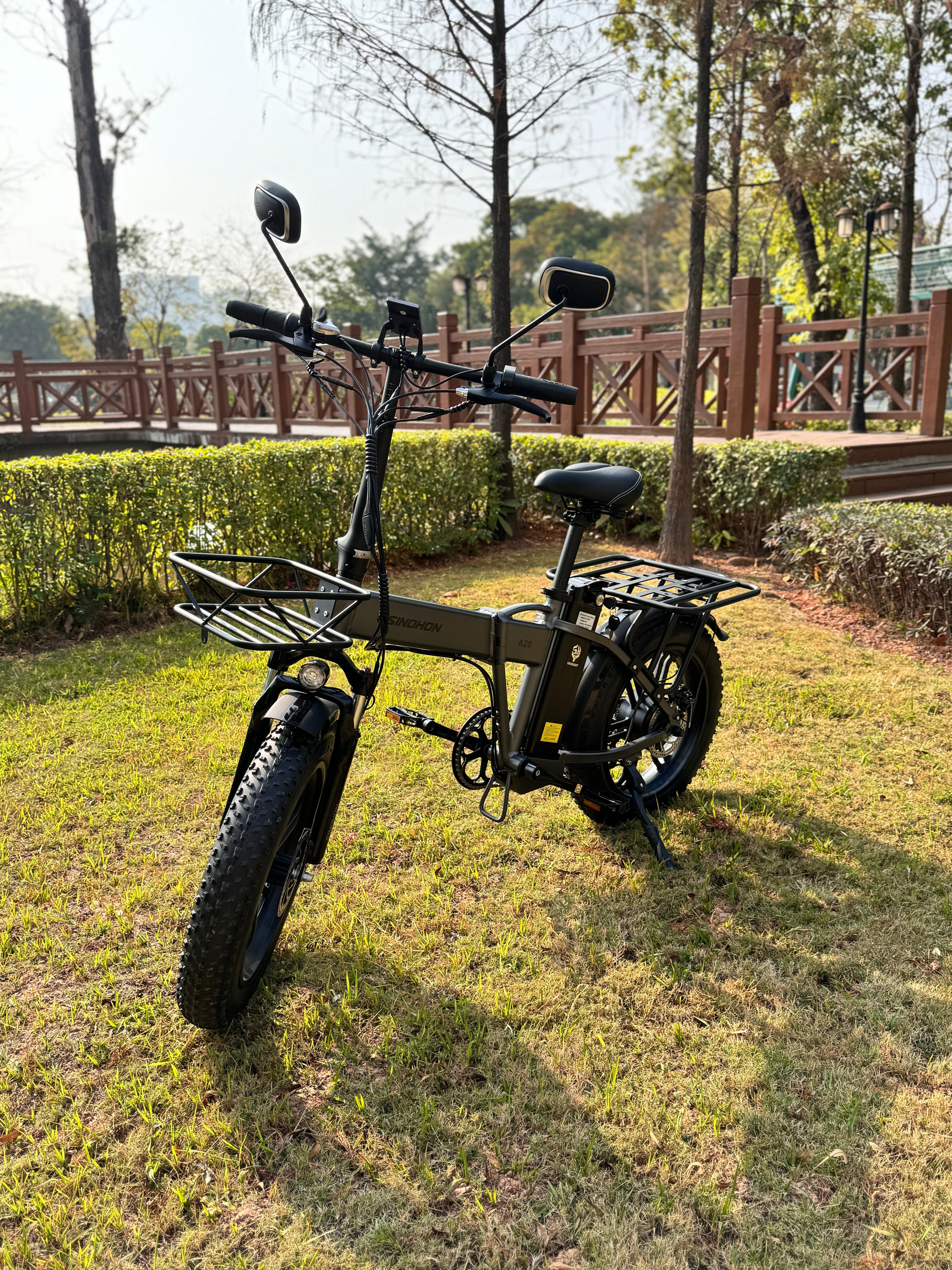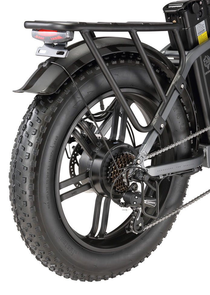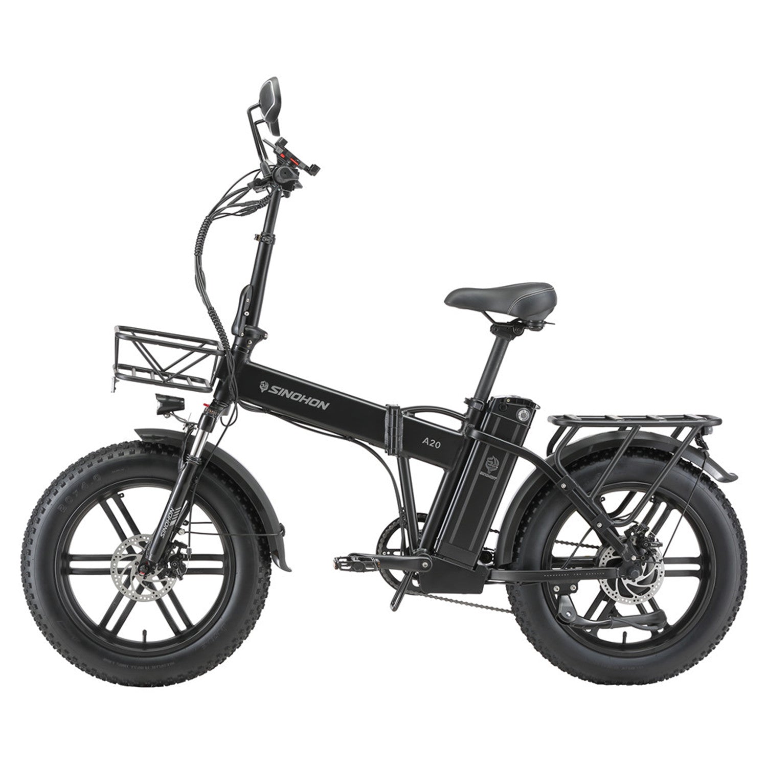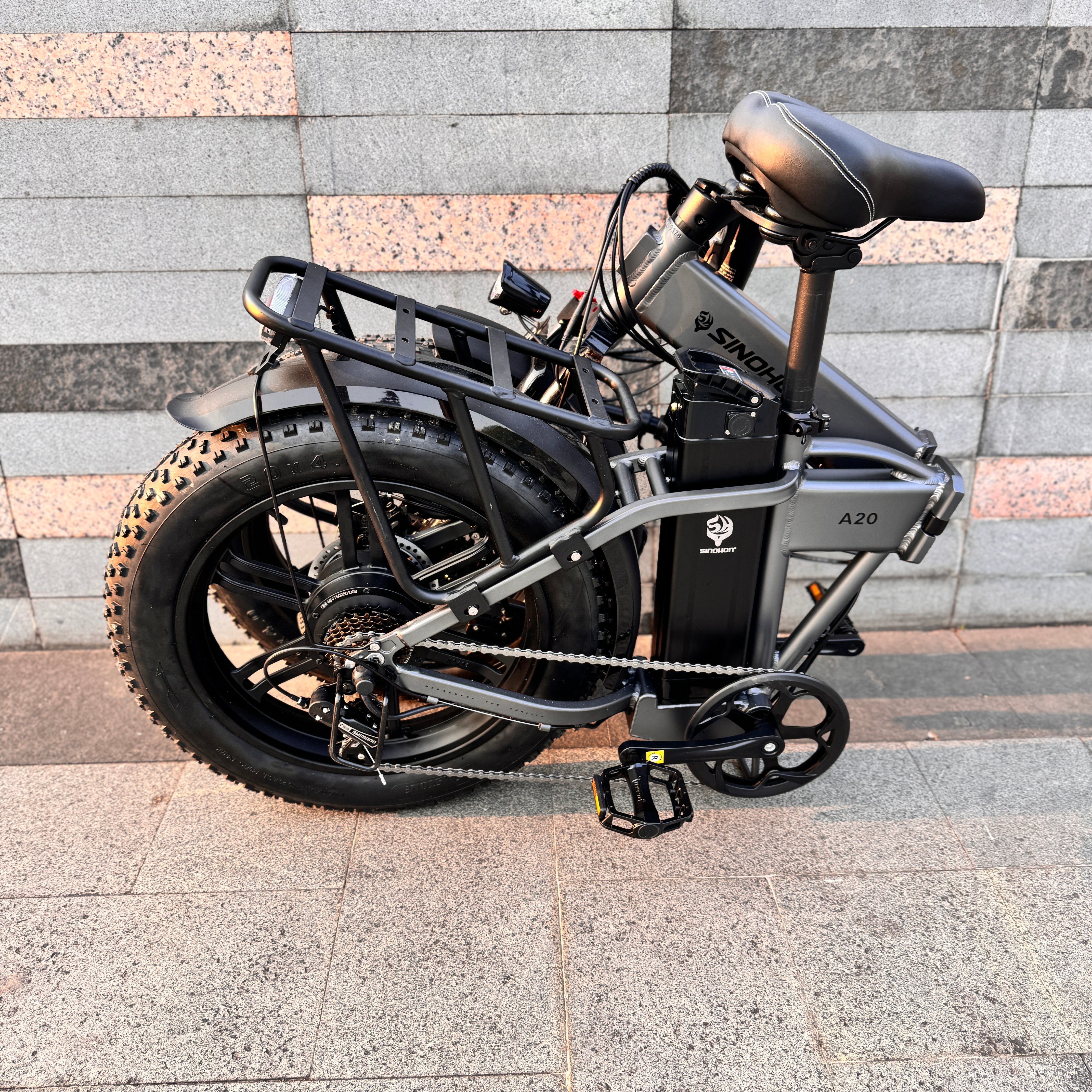 Sinohon A20 electric bike equipped with powerful peak 1000W motor / 20"x4.0 fat tires / front fork suspension / shimano 7 Speed derailleur system / foldable alloy frame, providing you with a smooth and powerful riding experience.
