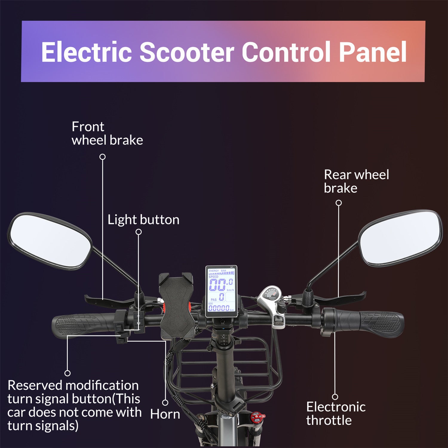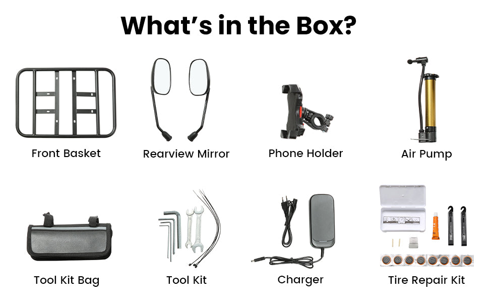 Front basket / Rearview mirror/ Phone holder / Air pump / Took kit with bag / Charger / Tire repair kit
