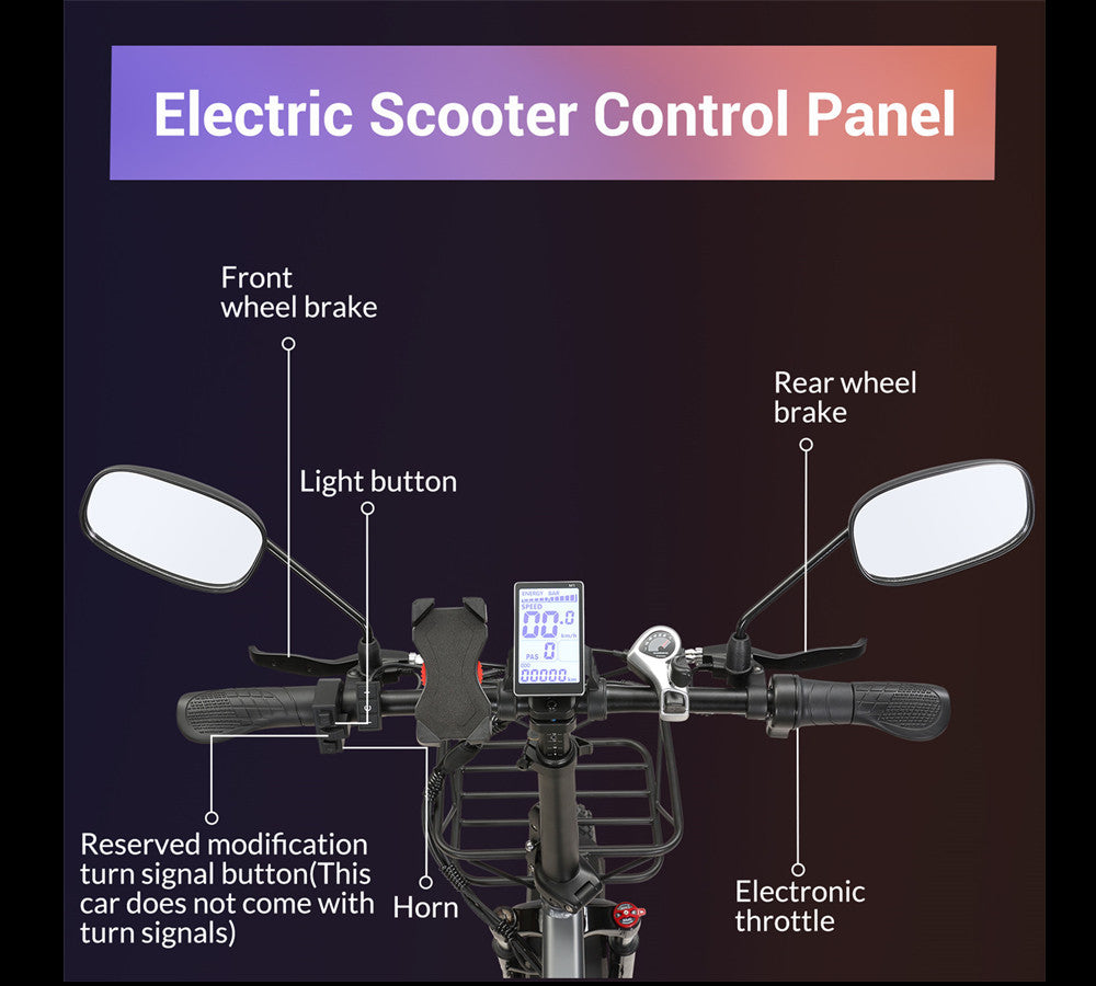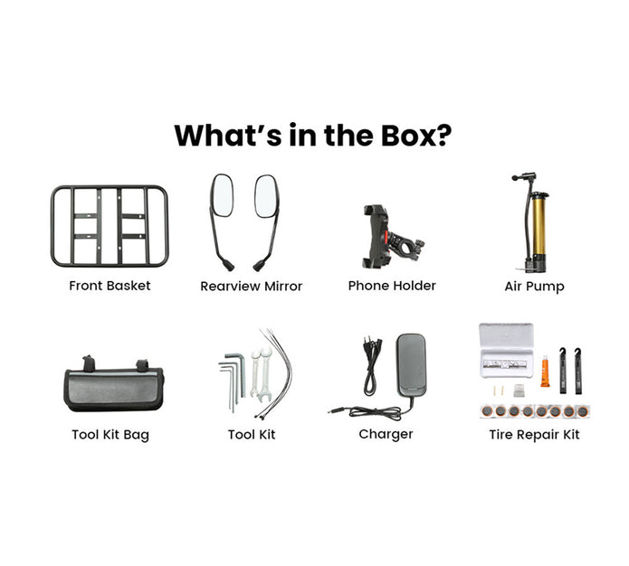 1 x User Manual/1 x Charger/1 x Tire Pump/2 x Rearview Mirror/1 x Front Basket/1 x Phone holder/1 x Multi tool kit